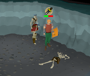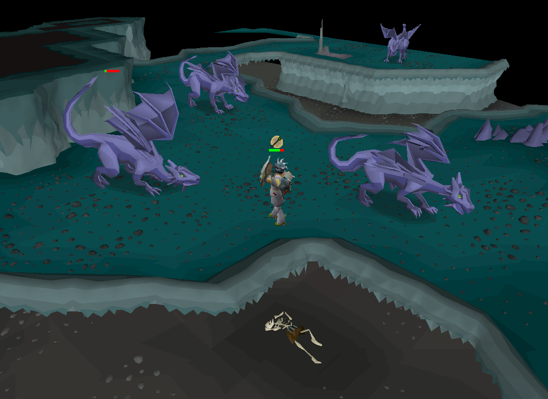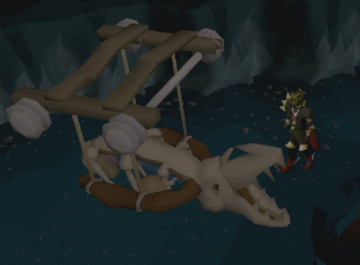 Lower levelled players visiting the cave should be focusing more on the barbarians and avoiding the dragons by rummaging barbarian skeletons on the ground. There is a skeleton just south of the safe spot described earlier. Chewed bones can also be obtained easily only from the Mithril dragons.
