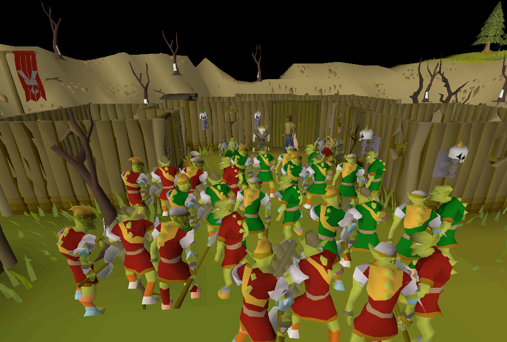 Now, go to the Lumbridge Swamp, and talk to the goblin sergeants, Sergeant Slimetoes and Sergeant Mossfists. They should be near the entrance to the Lumbridge Swamp Caves (make sure you have your light source for this part).