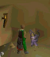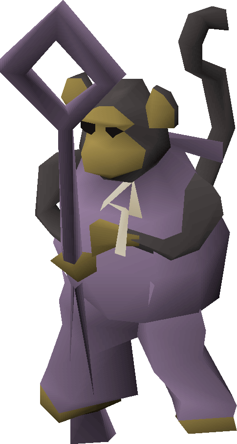Bonzara is a mysterious, purple monkey. He's found inside of the gorilla statue (possibly of Marimbo) inside the arena where you fought the Jungle demon during Monkey Madness I. To get to Bonzara, you must find a trapdoor that leads to the bottom floor and go through the banana trees and enter the crack in the statue. Bonzara says that you'll meet again. If you defeat the Jungle demon and go down the trapdoor, the gnomes won't be on the platform anymore, if so, Bonzara offers a free teleport to the north-western part of Ape Atoll, just around some snakes, and spiders, so be prepared. It is recommended, though, if you do not have a Greegree, to Home teleport from the platform.