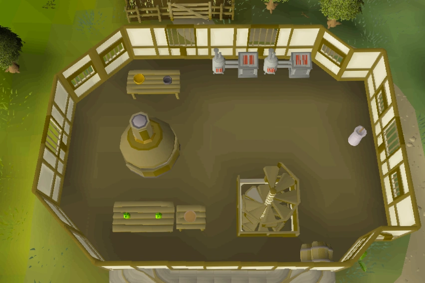 The 2nd floor[?] contains a hopper for players to put grain in it to make flour. There are various item spawn on tables, including grapes, a pot, a cooking apple, and a jug.