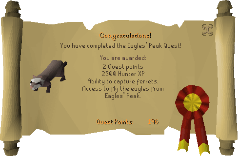 - Head to Eagles' Peak west of the Tree Gnome Stronghold or use Fairy ring code AKQ (use the boat Northeast of the fairy ring) or Necklace of passage (second option, The outpost).