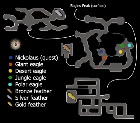 The Eagles' Peak Dungeon is found within the Eagles' Peak mountain and requires completion of the Eagles' Peak quest to enter. Here, players can use the eagle transport system to ride the hunter eagles to the Rellekka Hunter area, Uzer Hunter area, and Feldip Hunter area.