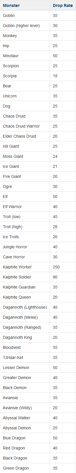 Goblin • Monkey • Imp • Minotaur • Scorpion • Bear • Unicorn • Dog • Chaos Druid • Giant • Ogre • Elf • Troll • Horror • Kalphite • Dagannoth • Bloodveld • TzHaar • Demon • Aviansie • Abyssal Creature • Dragon |