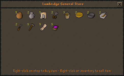 Each general store carries a few commonly used, inexpensive items. It rarely runs out of these items for long, as they tend to restock quickly. The following is the most conventional inventory for a general store: