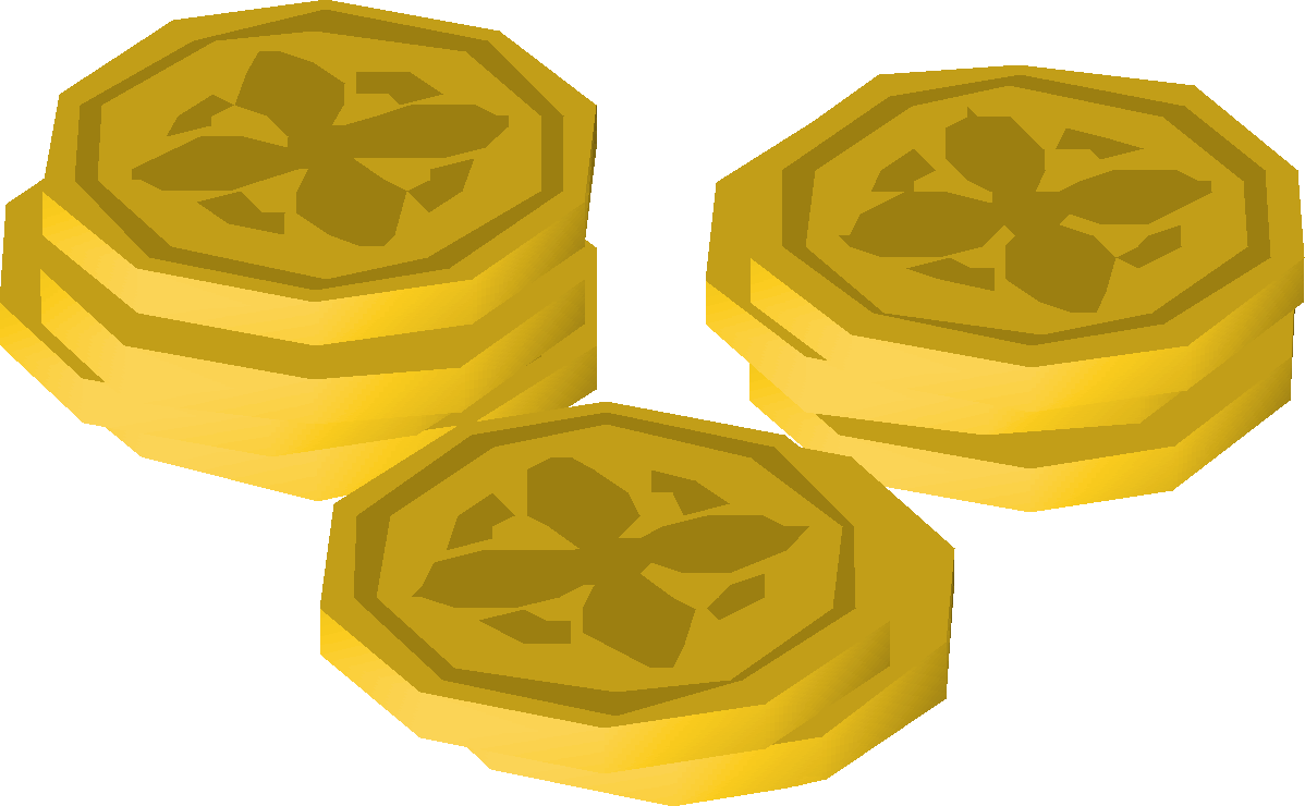 Coins (also referred to as gold pieces, gp, gold, or simply money) are the most common form of currency in Old School RuneScape. They can be used to represent the value of virtually every single tradeable item in the game, as well as various services offered throughout.