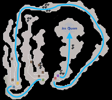 The Ice Queen's lair is a dungeon, located under the White Wolf Mountain. It plays a major role in Heroes' Quest, as the Ice Queen is located here. A pickaxe is required to access the lair. Level 50 Mining is required to remove the rockslide to gain access. Most players that come here slay the Ice Queen to obtain her ice gloves. If a player happens to lose their ice gloves, they may simply acquire a new pair by slaying the queen again.