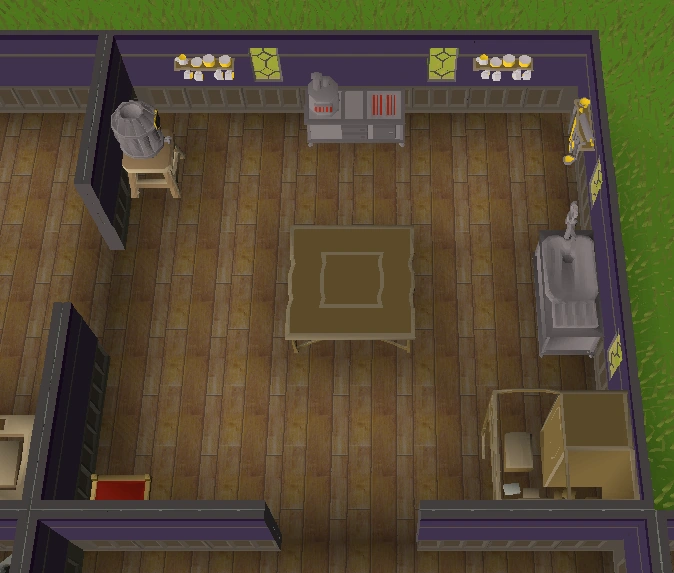 The Kitchen in a Player-owned house is a room that a player can build at level 5 Construction and has a cost of 5000 coins. Kitchens have two, non-parallel door spaces making it a good corner room.