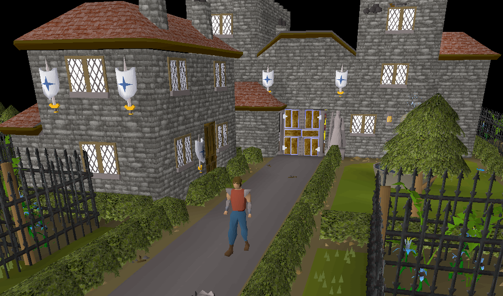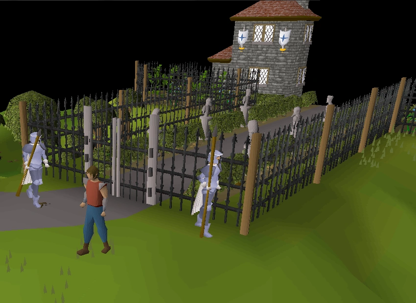Legends guard on duty, only letting players who have started or completed the Legends' Quest go through the gates. If a player who is a member of the guild enters the gates the guards proclaim "Legends' guild member approaching!".