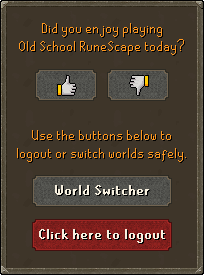 The Logout button is used to log out of Old School RuneScape. Depending on the client and/or Resizeable Mode, the button is either located on the bottom-right of the screen or the top-right corner. The logout button resembles a small door or an X, depending on the client and/or resizable mode. Once it is clicked, the player must click another button to actually log out. There is a grey bar reading "World Switcher" or the red bar reading "Click here to logout".