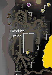 The lovakite mine is located in the northwestern section of the Lovakengj House in Great Kourend. Lovakite rocks are found here, which requires level 65 Mining and grants 10 Mining experience per lovakite ore mined. Coal rock deposits can be found here as well.