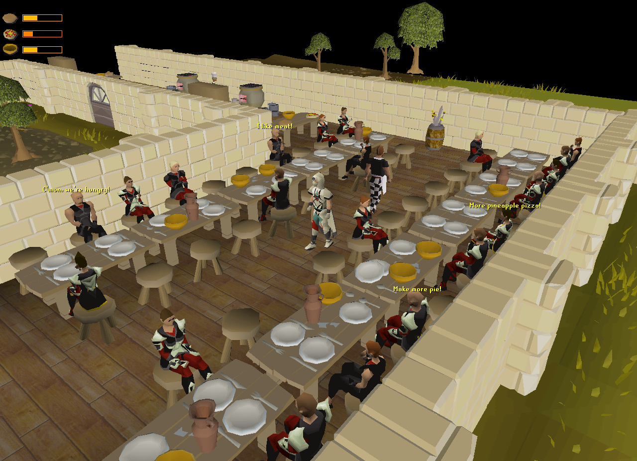 Players will have to make three types of food based on the interface on the top-left corner of the player's game client: servery meat pie, servery pineapple pizza, and servery stew. The interface shows which food will gain more of the soldiers' appreciation, which gives a greater amount of Hosidius favour and Cooking experience. Players will have to cook them within the mess, and obtain the ingredients from the various areas within the mess's kitchen.