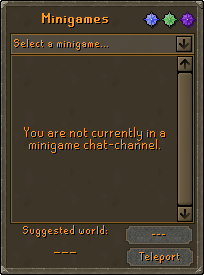 Selecting the desired minigame gives players the option to join the official clan chat as well as an option to teleport directly outside of the minigame. This can be useful when travelling around Gielinor as most of the listed minigames do not have any requirements to access.
