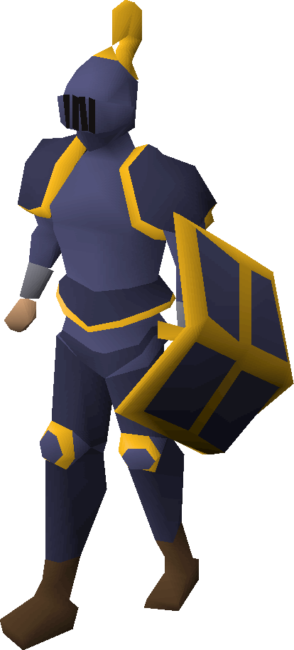 A player wearing a set of gold-trimmed mithril armour.