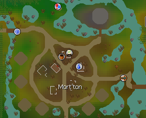 Mort'ton is located in Morytania, south of the Mort Myre Swamp. The town is populated with undead, like the afflicted and shades. The town has a general store and is the start for the Shades of Mort'ton quest and the Shades of Mort'ton minigame. If you are doing the Shades of Mort'ton quest it is best for players to go to world 377 to build the temple as most people are there building the temple. Barrows can be found just east of the city.