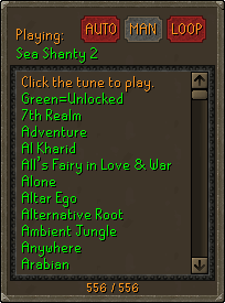 Players can click on the loop button at the top of the screen. If it is on, the track played on that moment will automatically repeat itself. Players can also click on green titles to choose which track to listen to. Titles in red have not been unlocked, and thus cannot be played.
