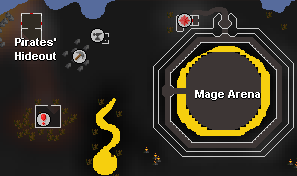 The Pirates' Hideout mine, or Pirates' Mine, is a mining site located east of the Pirates' Hideout in the deep Wilderness. It contains 1 iron ore rock, 4 mithril rocks, 1 adamantite rock and 3 coal rocks. Player killing in the Wilderness greatly increases the risk of mining at this site along with all Wilderness mines, so mining at this site can be very dangerous. There are also a number of giant bats around this mine. The closest bank is in the Mage Arena; however, players will need a sharp object (like a knife) to cut through the webs blocking its entrance.