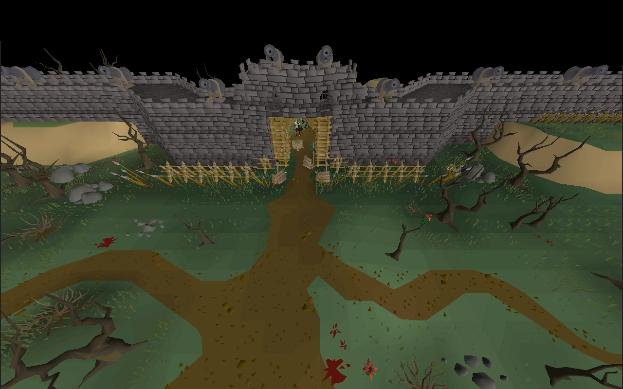 West of this wall is the Lizardman Settlement, home to hostile lizardmen, brutes and shamans, who can poison unprepared players.