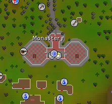 The South-east Ardougne mine, also referred to as Monastery Mine or South Ardougne Mine, can be found south of East Ardougne and east of the Clock Tower near the Kandarin Monastery. It contains four (4) coal rocks and six (6) iron rocks, which form a channel leading to the monastery door.
