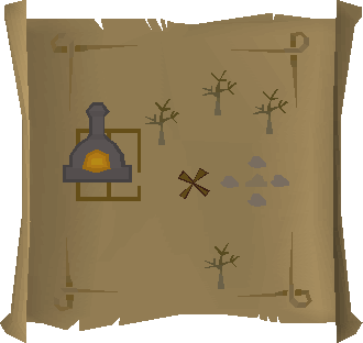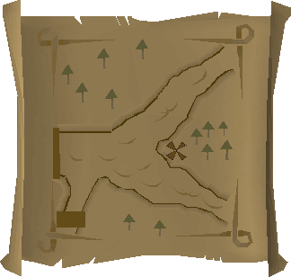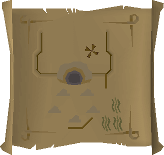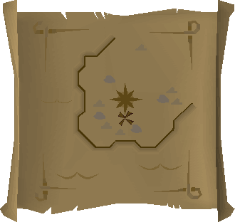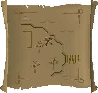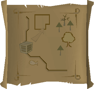 Map clues are an image of a location the player needs to search to advance along their trail. Maps are found across all clue scroll difficulties. They are rough pictures of a very local area. If the map leads to an X, the player needs to take a spade to the place indicated on the map with the X and dig there. If the map leads to a crate, it must simply be searched. Sometimes, players may find a small pile of crates, or a multitude of them. Search all of them until the next clue or the reward is found. Maps can include landmarks such as buildings, fish to indicate fishing spots, roads, rivers, bridges, and so on.