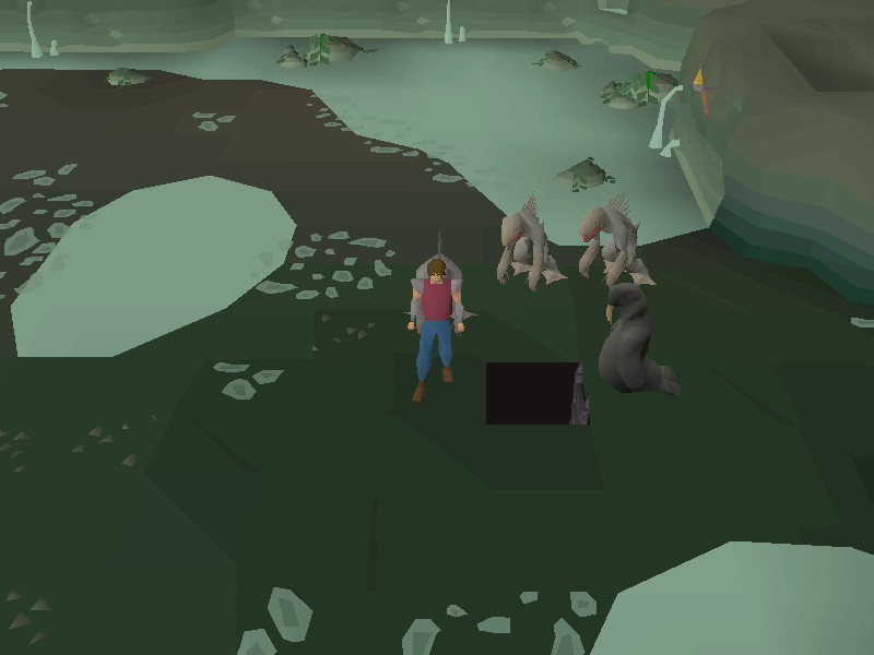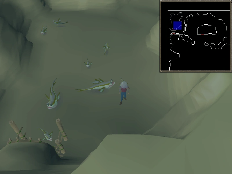 Inside the mudskipper cave west of the Mogre Camp. Players must collect five rocks before going inside. |