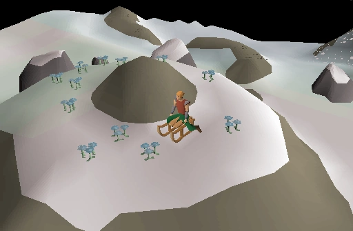 The mountain slopes steeply go down from north to south, making going back on foot impossible. To travel back to civilisation, players must have a sled in their inventory. Along the slope are several item respawns, such as sapphires, chaos runes, and extra sleds. Once the player has travelled across the entire mountain, they will arrive at a small area at the south end of the mountain. The only way out from that area is through a small troll-infested tunnel that leads to both Keldagrim and the Fremennik Province.