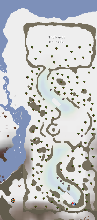 Trollweiss Mountain is one of the largest mountains in RuneScape. It is covered year-round in a thick layer of ice and snow, and powerful winds constantly sweep across it. Because of its harsh environment, little can survive on it apart from ice wolves, large evergreen trees, and the endangered Trollweiss flower.