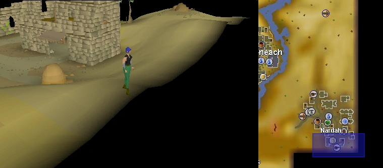 The unknown border south of Nardah shown in-game (left), and on the world map (right).