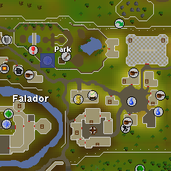 Falador Park. Ask if he has any jobs for you, and he lets you know that a clerk has made an error and that you're not actually permitted to be a