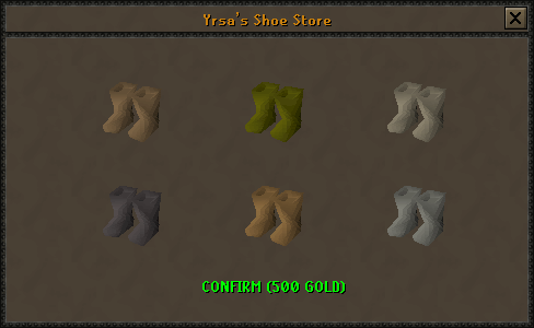 Yrsa's Shoe Store is a shop in Rellekka. As well as selling clothes, Yrsa can change your shoe colour for 500 coins. There are six available colours. Both access to the store's stock and the ability to change one's shoes require the completion of the Fremennik Trials quest. Visiting the store is a part of the Fremennik easy achievement diary.